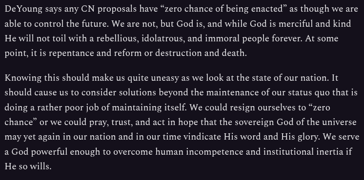 Further, I don’t think abandoning a quest for Christian civic virtue because “snowball’s chance in hell” is particularly heavenly-minded. Why not consider the power of God over all things more in this discussion?