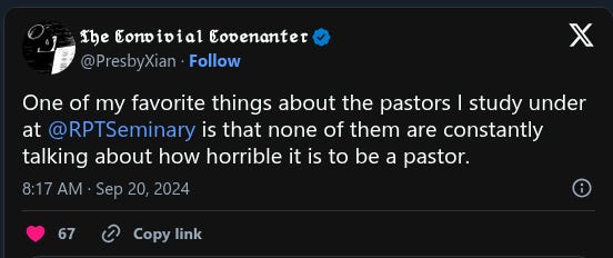 We don’t discuss this enough. A lot of the advice peddled to pastors and seminarians by professors, authors, influencers, etc. seems focused on how uniquely difficult and terrible pastoral ministry, congregations, and congregants are.