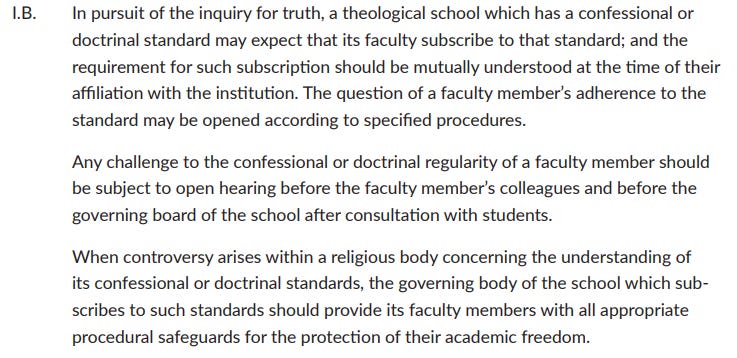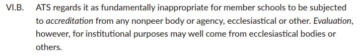 Also in Policy Guidelines, ATS requires schools to protect academic freedom of professors when confessional and ecclesiastical disputes arise. Might explain how seminaries seem to circle the wagons when their faculty come under fire for their teachings.