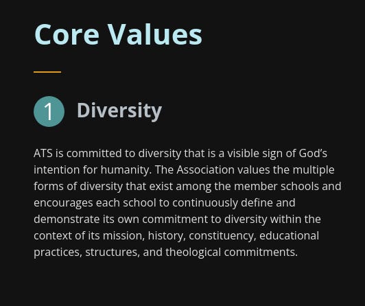 ATS lists diversity as its #1 core value. Before “Quality and Improvement” (#2), “Collegiality” (#3), and “Leadership” (#4). ats.edu/About-ATS